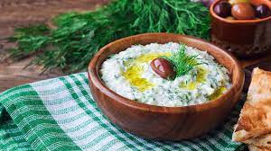 1 Salatgurke 4 Zehen Knoblauch 2 Stängel Dill 500 g griechischer Joghurt 2 EL Olivenöl Salz Pfeffer
